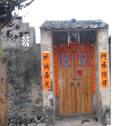 傳統(tǒng)民居主要以一層坡屋頂為主,一般呈三合院格局。主屋前方多有一照壁,主要是為了避兇避難。在主屋頂上放置陶罐,灌口正對大門。最初是為了鎮(zhèn)宅避兇之用后逐漸演變?yōu)橐环N傳統(tǒng)的建筑裝飾。